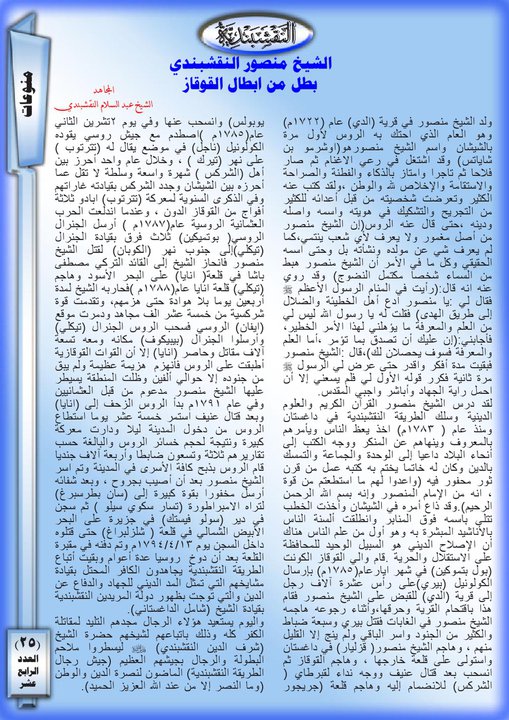 العدد الرابع عشر الشيخ منصور النقشبندي بطل من ابطال القوقاز 15 مارس، 201225 يونيو، 2019 الشيخ منصور النقشبندي بطل من ابطال القوقاز