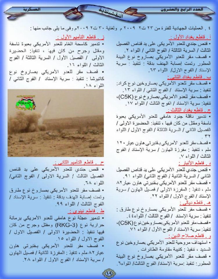 العدد الرابع والعشرون جانب من العمليات الجهادية لجيش رجال الطريقة النقشبندية للفترة من 1 تشرين الثاني 2009 م ولغاية 30 تشرين الثاني 2009 م 19 مارس، 201225 يونيو، 2019 جانب من العمليات الجهادية لجيش رجال الطريقة النقشبندية للفترة من 1 تشرين الثاني 2009 م ولغاية 30 تشرين الثاني 2009 م