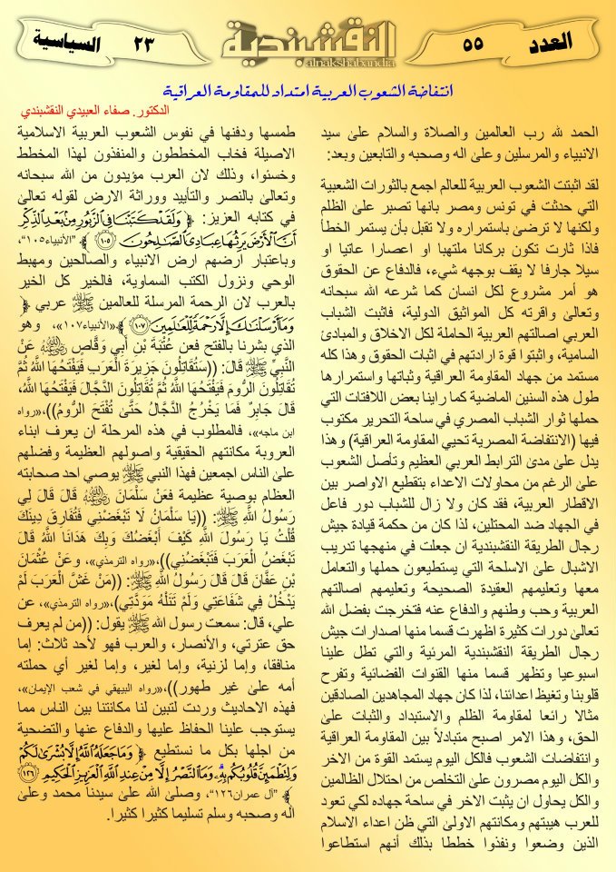 العدد الخامس والخمسون انتفاضة الشعوب العربية امتداد للمقاومة العراقية 20 مارس، 201225 يونيو، 2019 انتفاضة الشعوب العربية امتداد للمقاومة العراقية