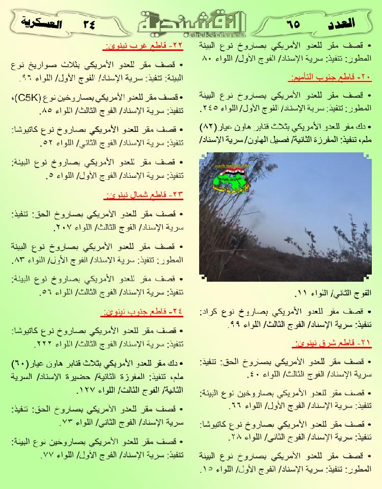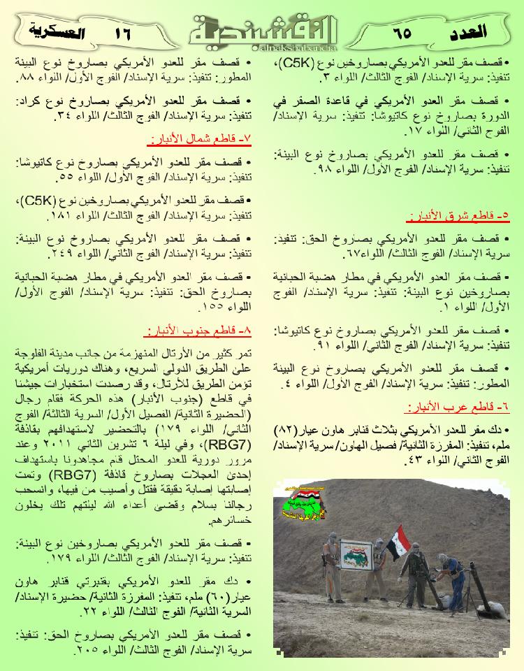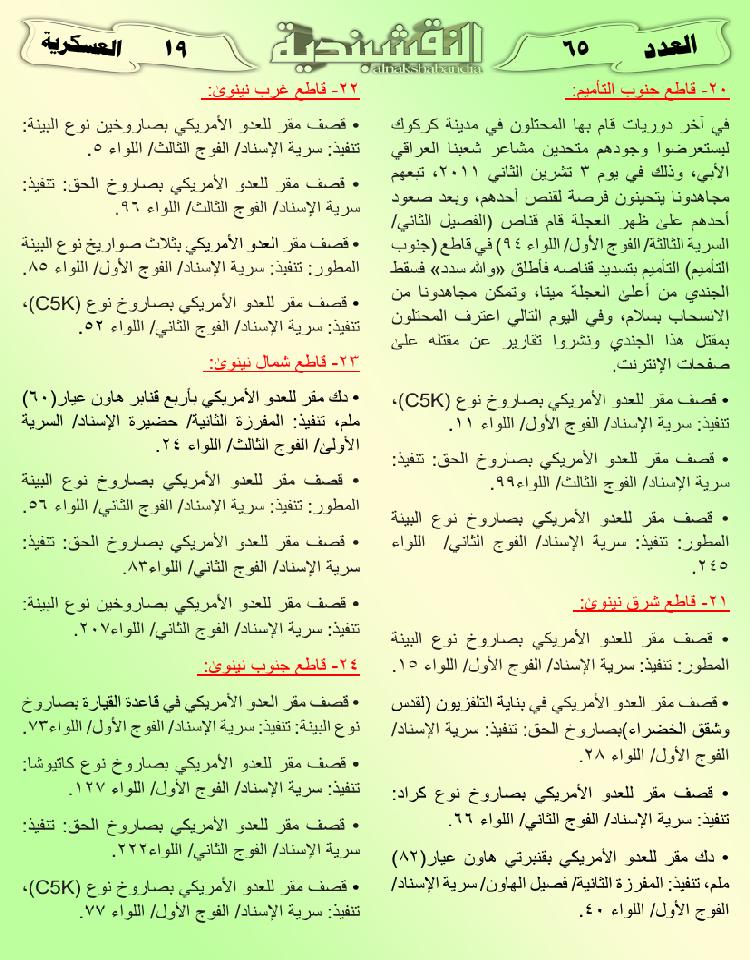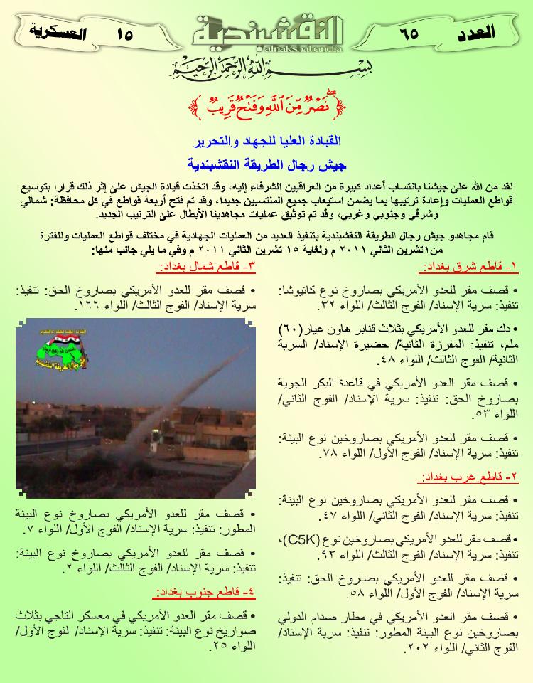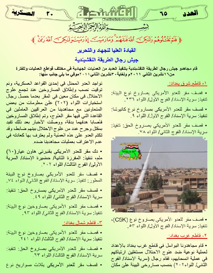 العدد الخامس والستون جانب من العمليات الجهادية لجيش رجال الطريقة النقشبندية للفترة من 1تشرين الثاني 2011م الى 30 تشرين الثاني 2011م 21 مارس، 201225 يونيو، 2019 جانب من العمليات الجهادية لجيش رجال الطريقة النقشبندية للفترة من 1تشرين الثاني 2011م الى 30 تشرين الثاني 2011م