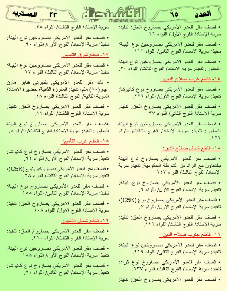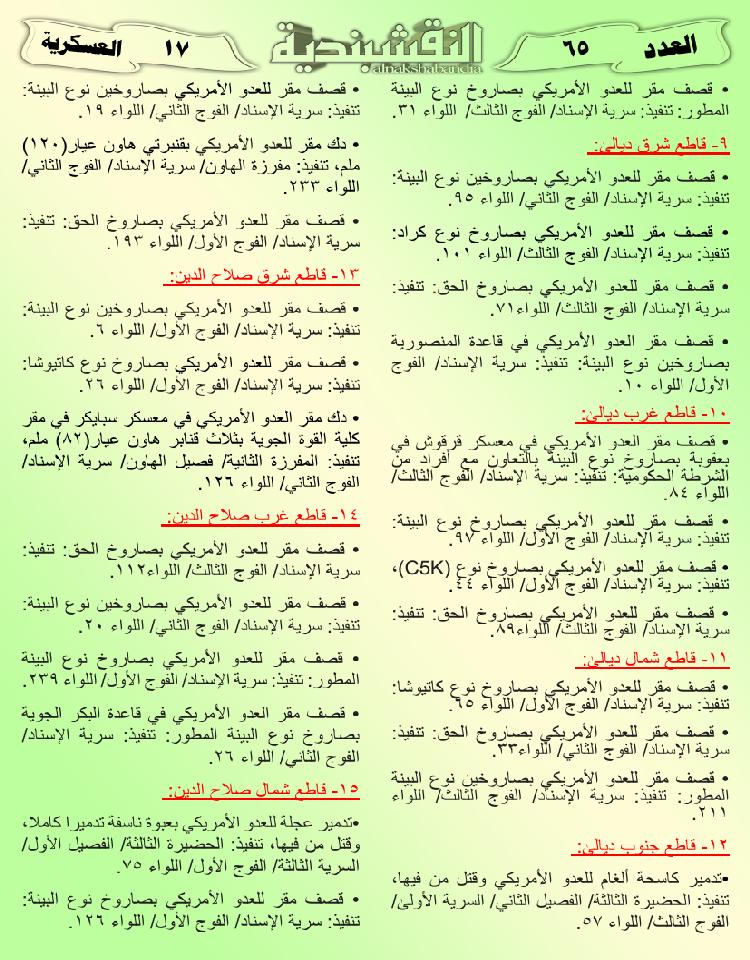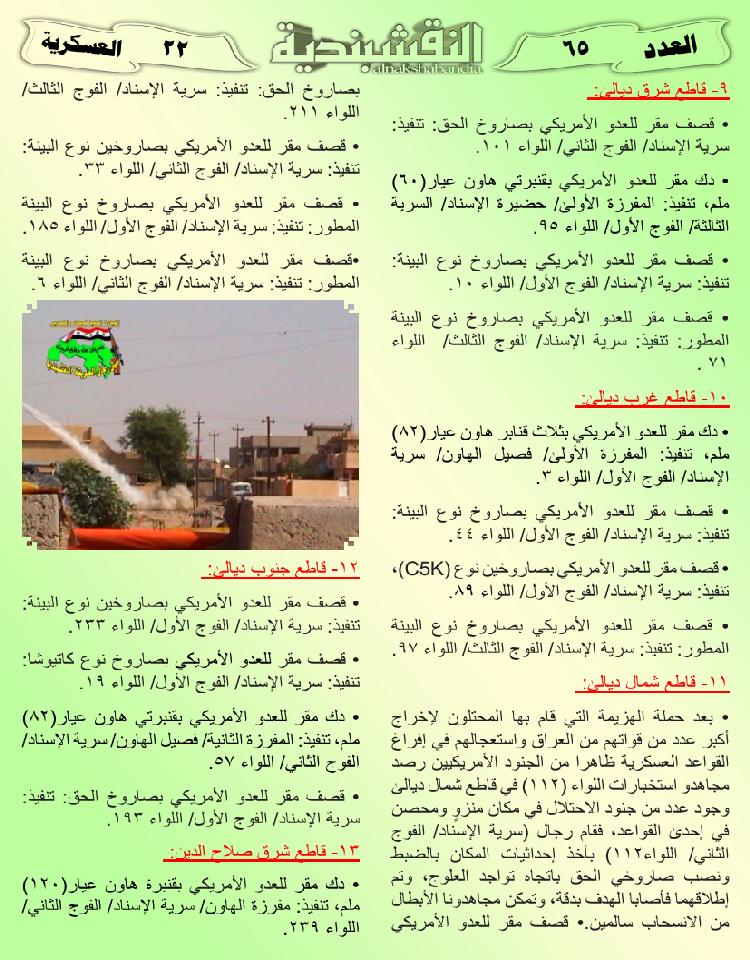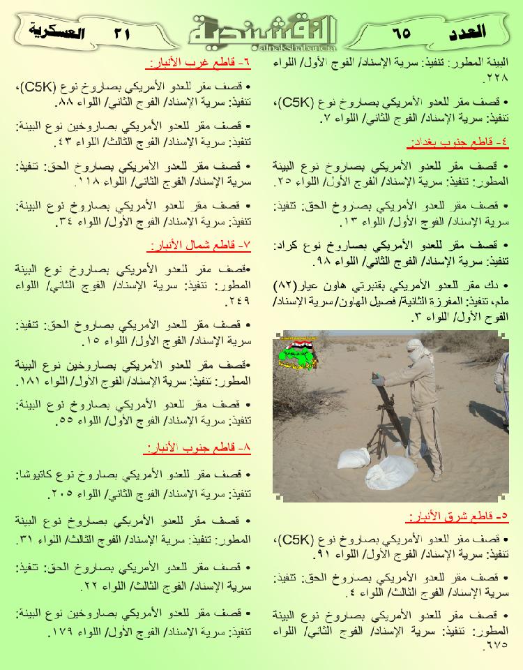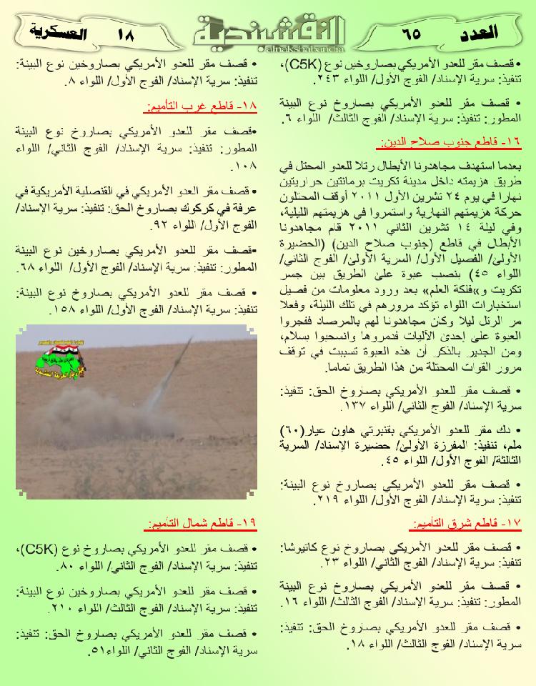 العدد الخامس والستون جانب من العمليات الجهادية لجيش رجال الطريقة النقشبندية للفترة من 1تشرين الثاني 2011م الى 30 تشرين الثاني 2011م 21 مارس، 201225 يونيو، 2019 جانب من العمليات الجهادية لجيش رجال الطريقة النقشبندية للفترة من 1تشرين الثاني 2011م الى 30 تشرين الثاني 2011م