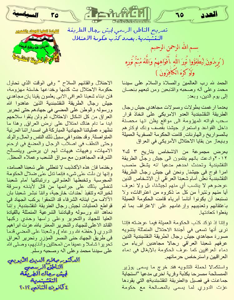العدد الخامس والستون تصريح الناطق الرسمي لجيش رجال الطريقة النقشبندية بصدد كذب حكومة الاحتلال 21 مارس، 201225 يونيو، 2019 تصريح الناطق الرسمي لجيش رجال الطريقة النقشبندية بصدد كذب حكومة الاحتلال