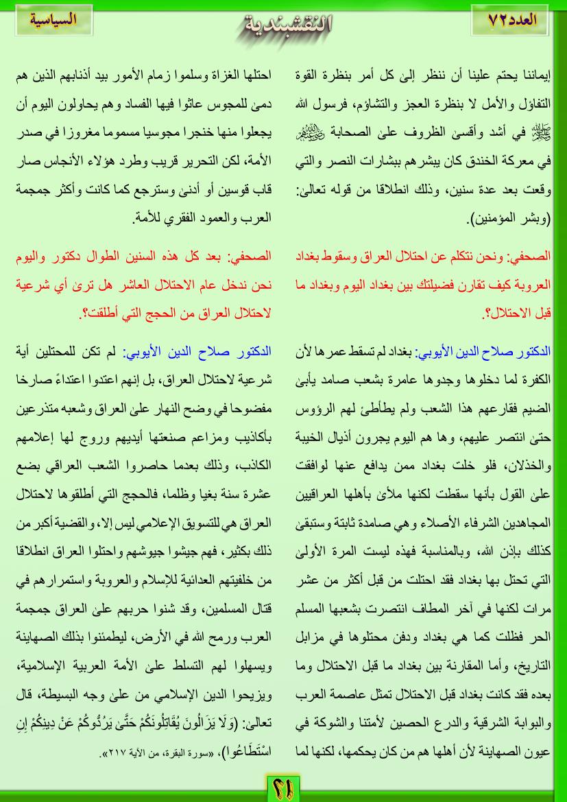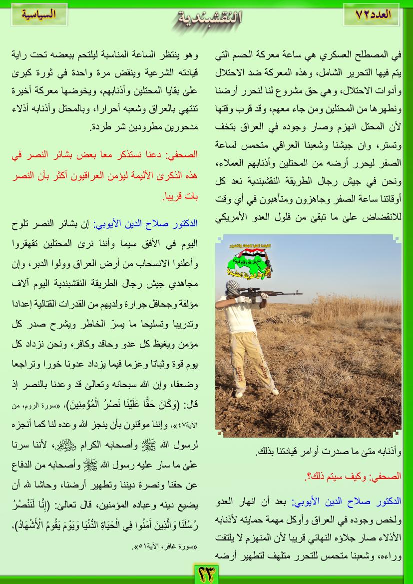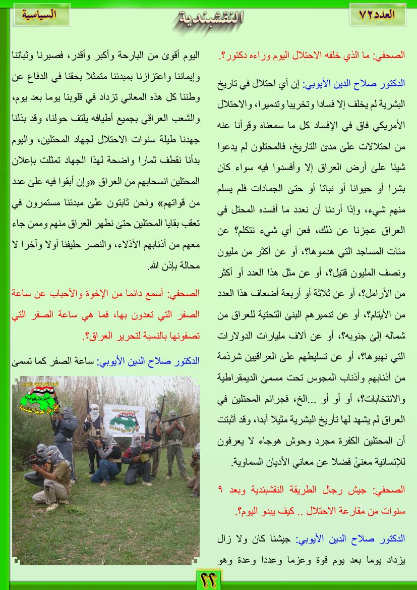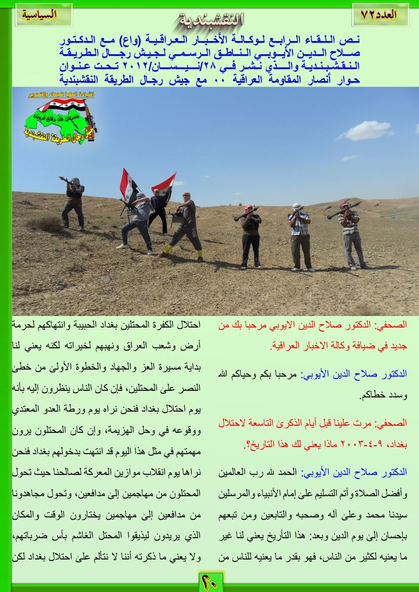 العدد الثاني والسبعون نص اللقاء الرابع لوكالة الأخبار العراقية (واع) مع الدكتور صلاح الدين الأيوبي الناطق الرسمي لجيش رجال الطريقة النقشبندية 13 أغسطس، 201225 يونيو، 2019 نص اللقاء الرابع لوكالة الأخبار العراقية (واع) مع الدكتور صلاح الدين الأيوبي الناطق الرسمي لجيش رجال الطريقة النقشبندية والذي نشر في 28/نيسان/2012 تحت عنوان حوار أنصار المقاومة العراقية .. مع جيش رجال الطريقة النقشبندية