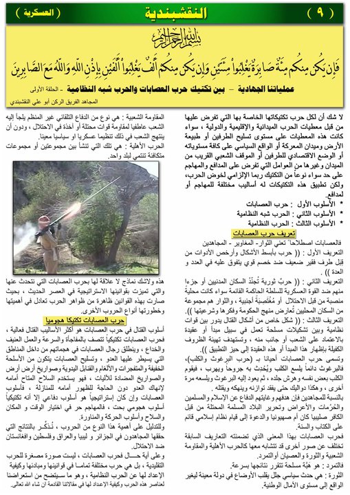 العدد الأول عملياتنا الجهادية – بين تكتيك حرب العصابات والحرب الشبه النظامية 27 فبراير، 201225 يونيو، 2019 عملياتنا الجهادية – بين تكتيك حرب العصابات والحرب الشبه النظامية – الحلقة الأولى ... قراءة المزيد