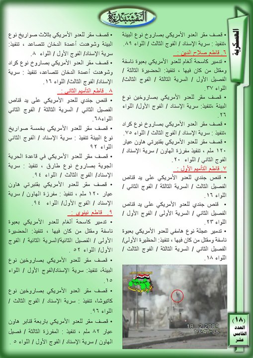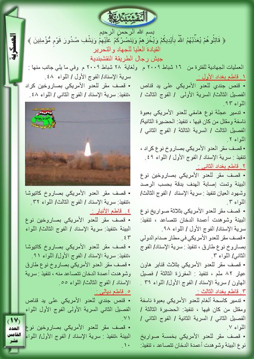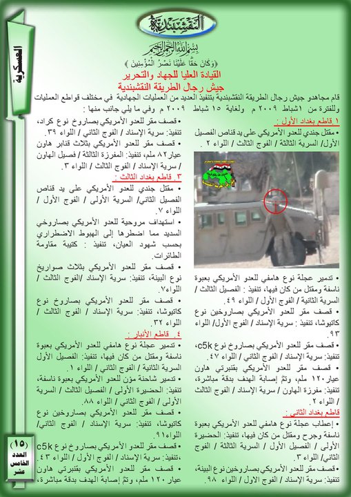 العدد الخامس عشر جانب من العمليات الجهادية لجيش رجال الطريقة النقشبندية للفترة من 1شباط 2009 الى 28 شباط 2009 19 مارس، 201225 يونيو، 2019 جانب من العمليات الجهادية لجيش رجال الطريقة النقشبندية للفترة من 1شباط 2009 الى 28 شباط 2009 ... قراءة المزيد
