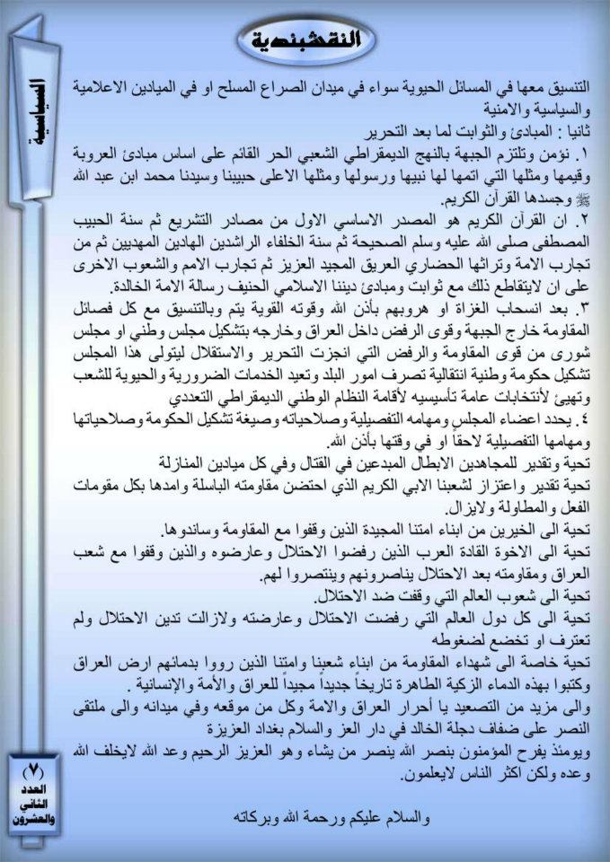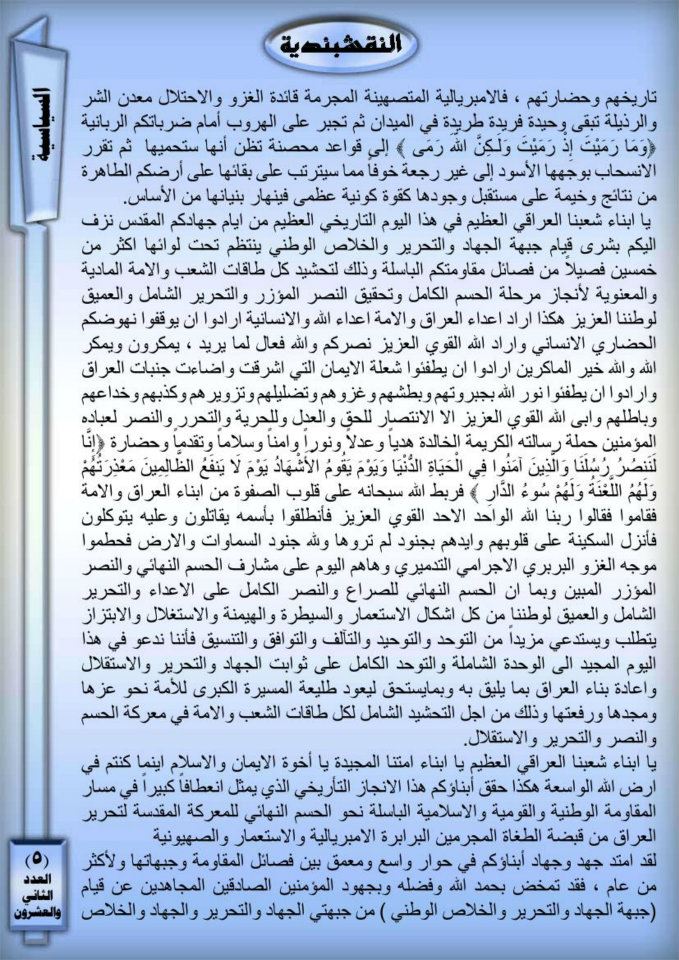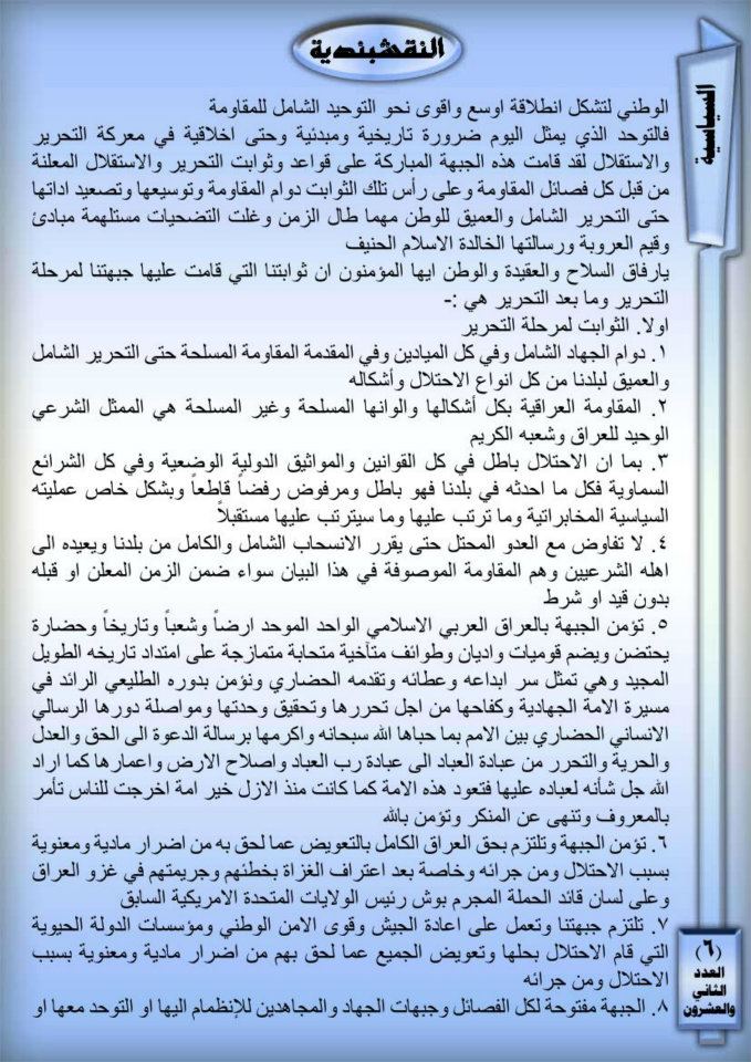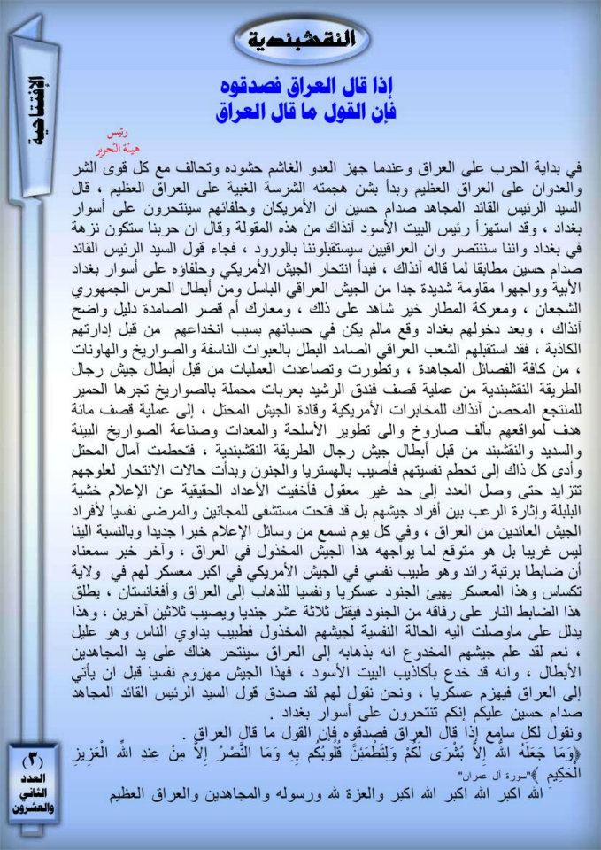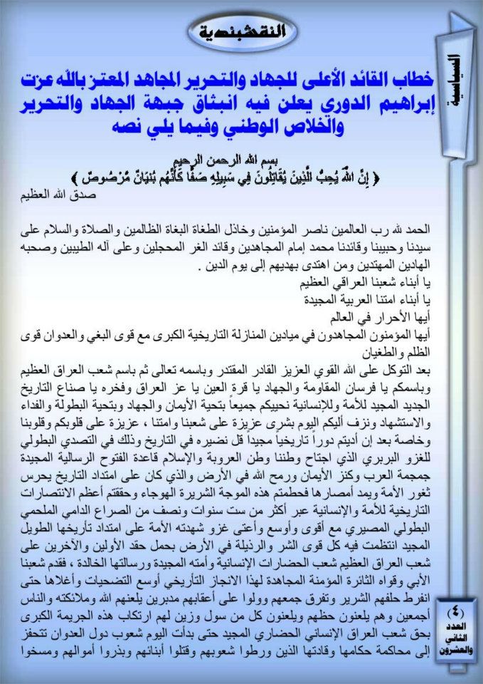 خطاب القائد الأعلى للجهاد والتحرير المجاهد المعتز بالله عزت إبراهيم الدوري يعلن فيه انبثاق جبهة الجهاد والتحرير والخلاص الوطني