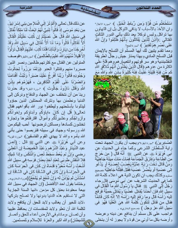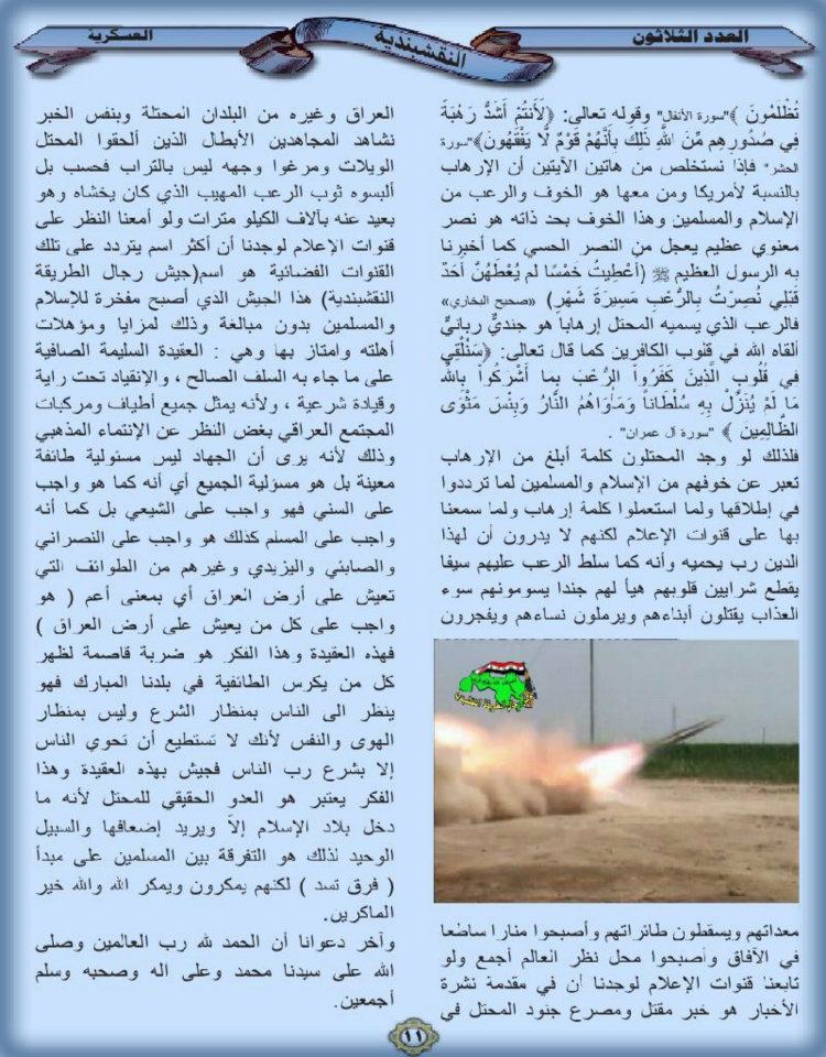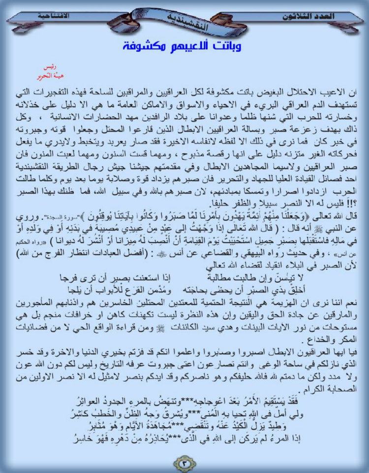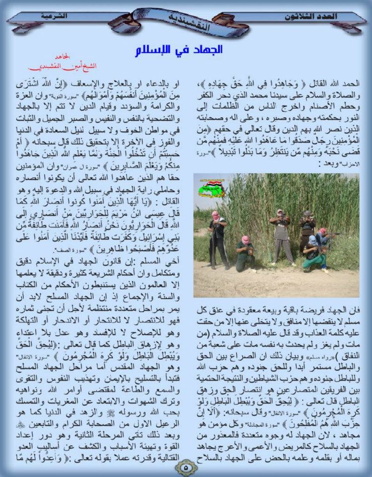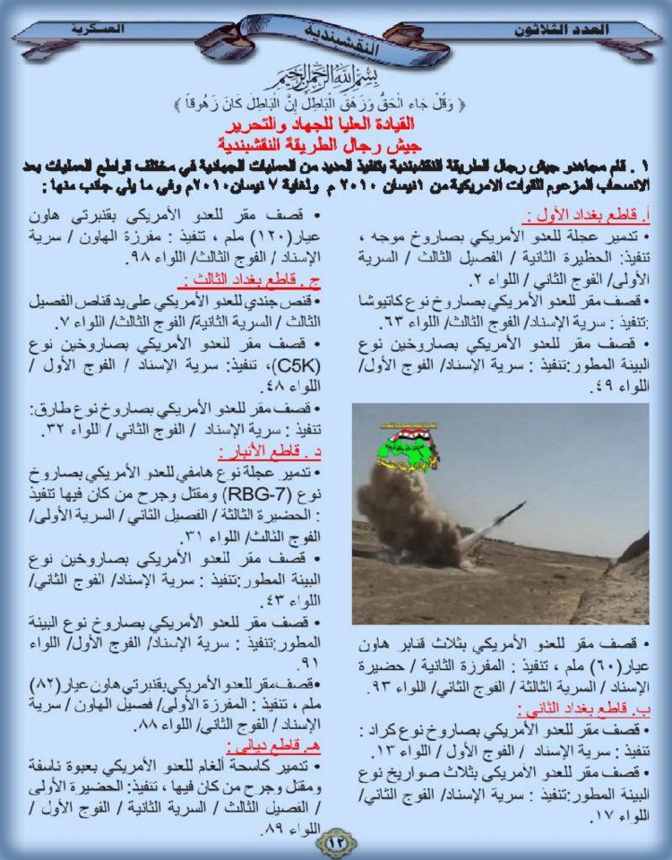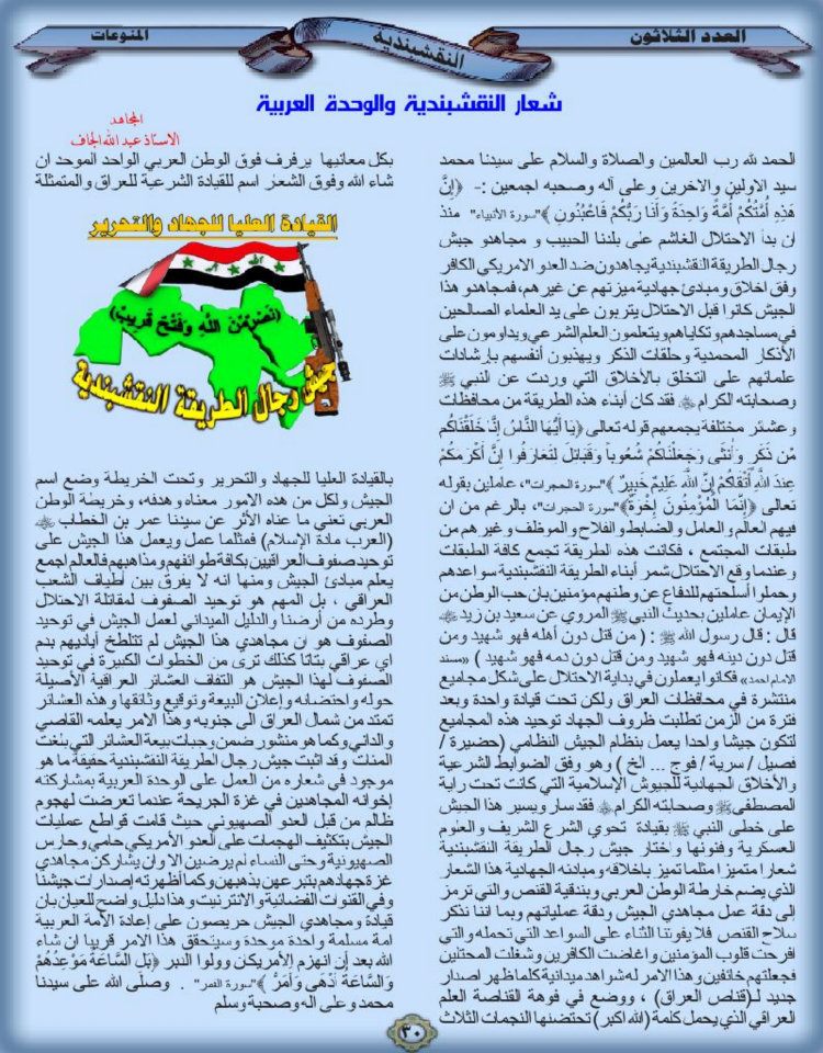 العدد الثلاثون جانب من العمليات الجهادية لجيش رجال الطريقة النقشبندية للفترة من 1 نيسان 2010 م ولغاية 30 نيسان 2010 م 21 مارس، 201225 يونيو، 2019 جانب من العمليات الجهادية لجيش رجال الطريقة النقشبندية للفترة من 1 نيسان 2010 م ولغاية 30 نيسان 2010 م ... قراءة المزيد