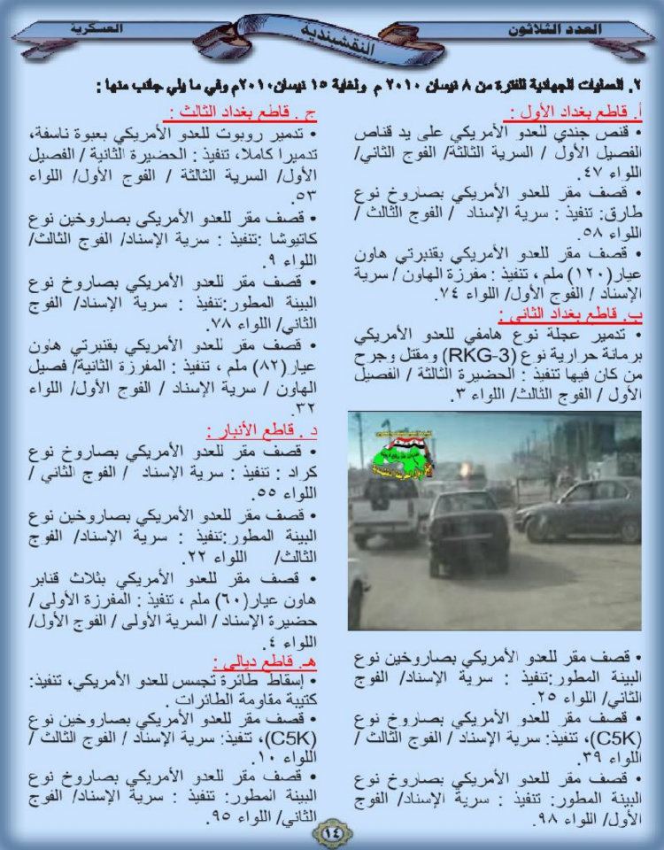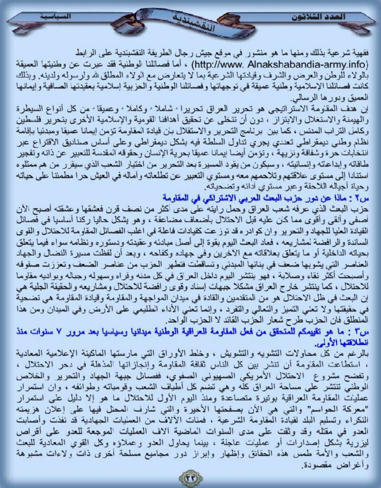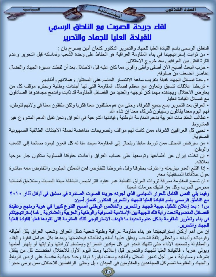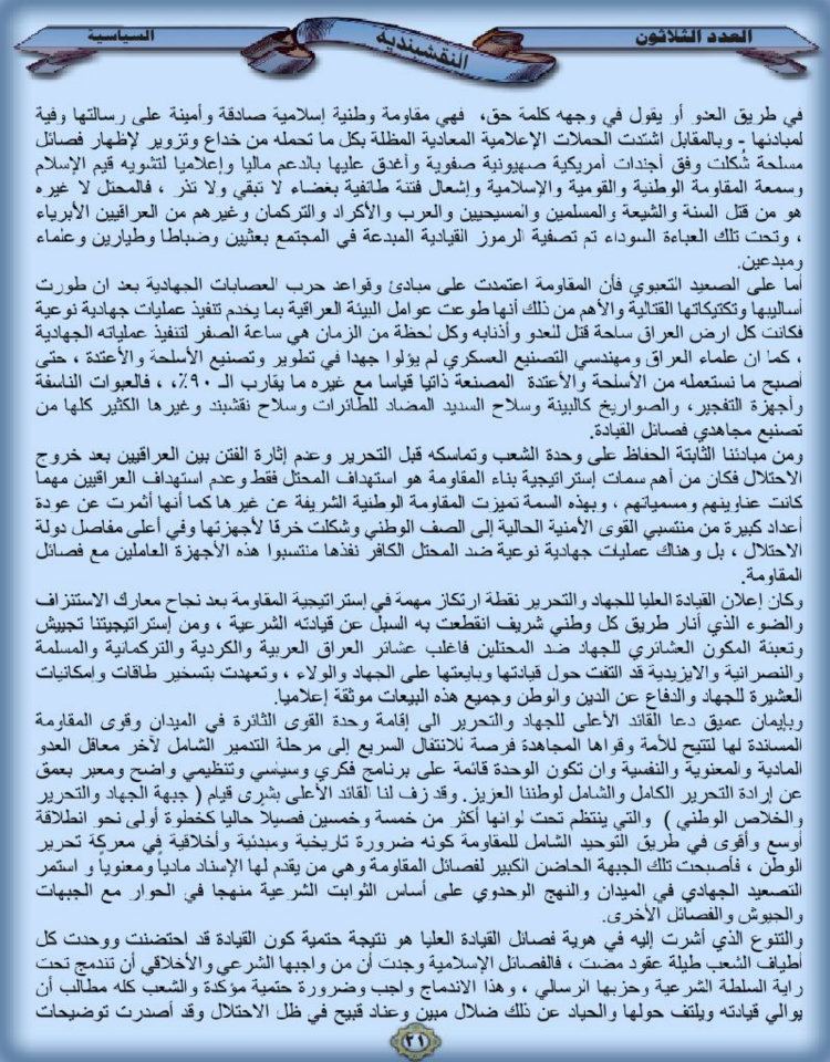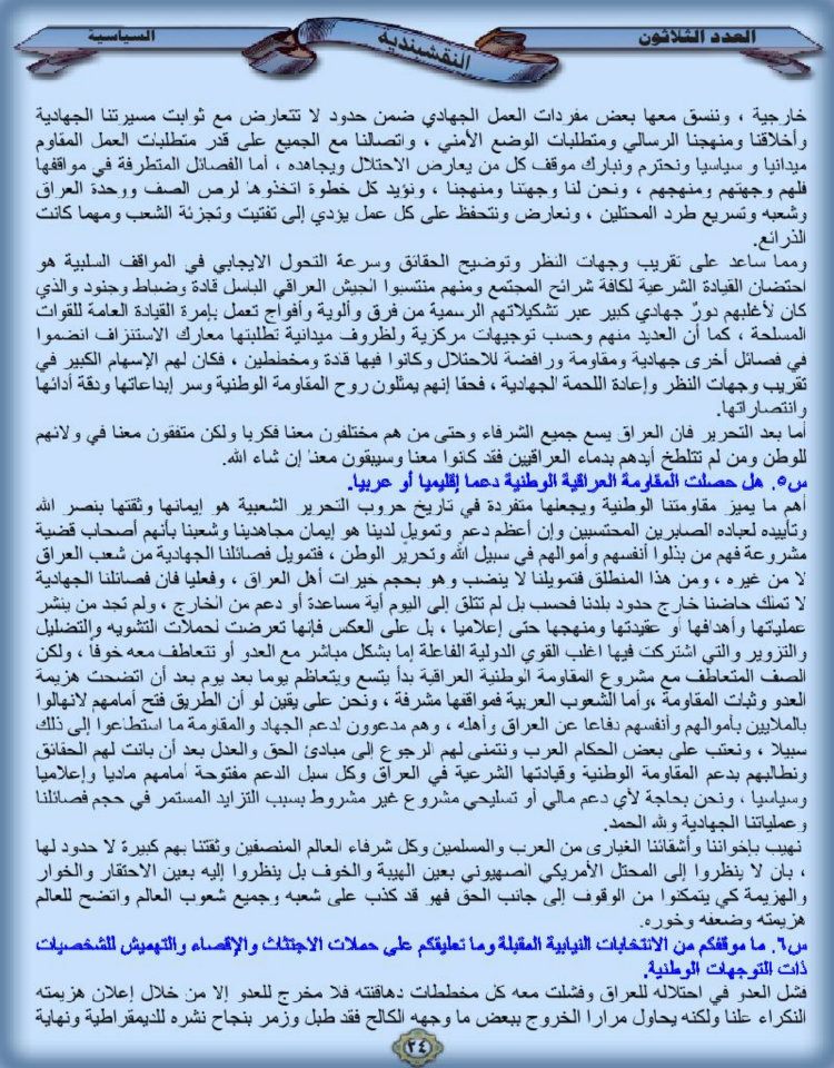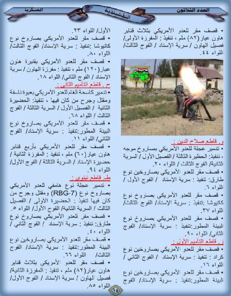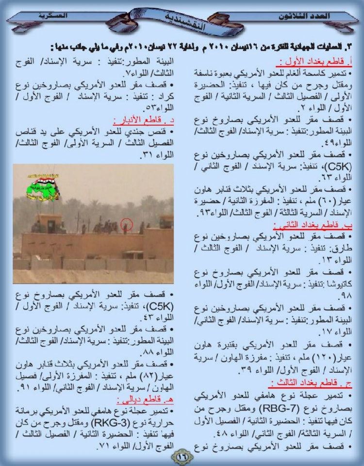 العدد الثلاثون جانب من العمليات الجهادية لجيش رجال الطريقة النقشبندية للفترة من 1 نيسان 2010 م ولغاية 30 نيسان 2010 م 21 مارس، 201225 يونيو، 2019 جانب من العمليات الجهادية لجيش رجال الطريقة النقشبندية للفترة من 1 نيسان 2010 م ولغاية 30 نيسان 2010 م ... قراءة المزيد