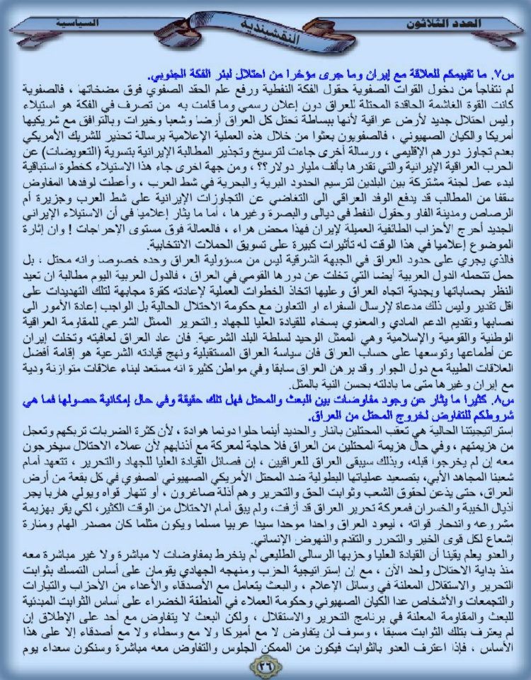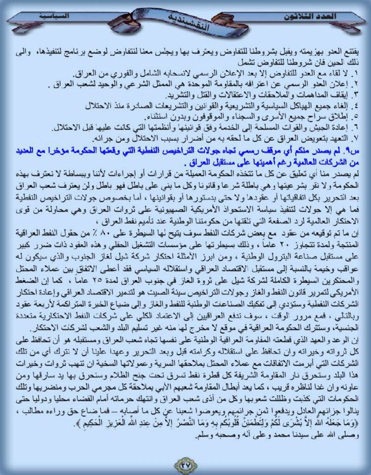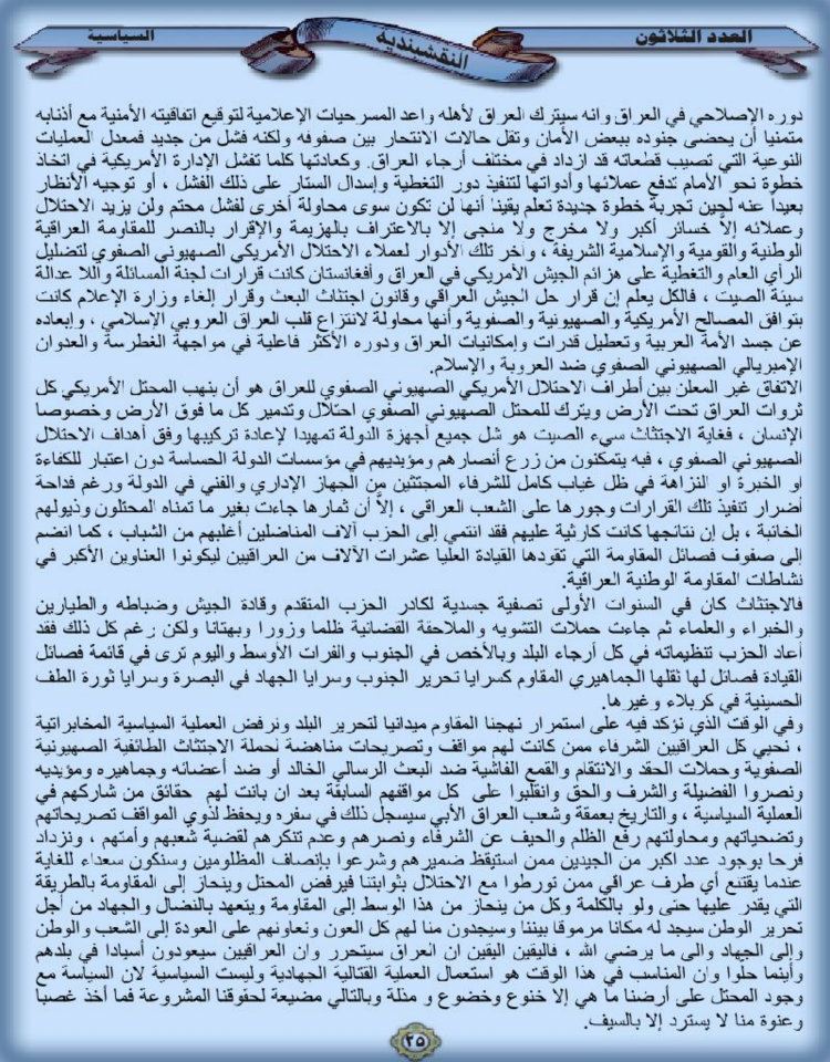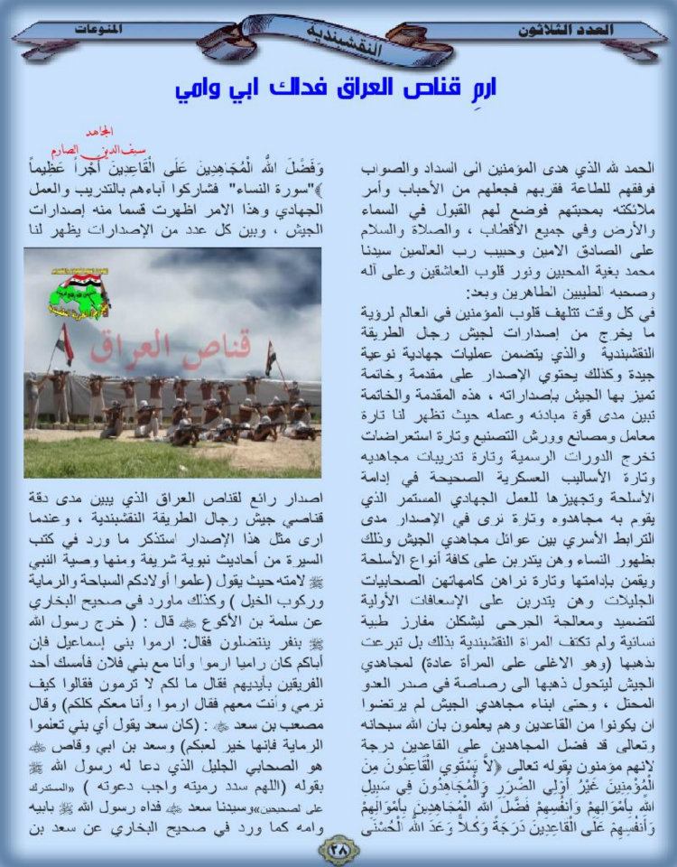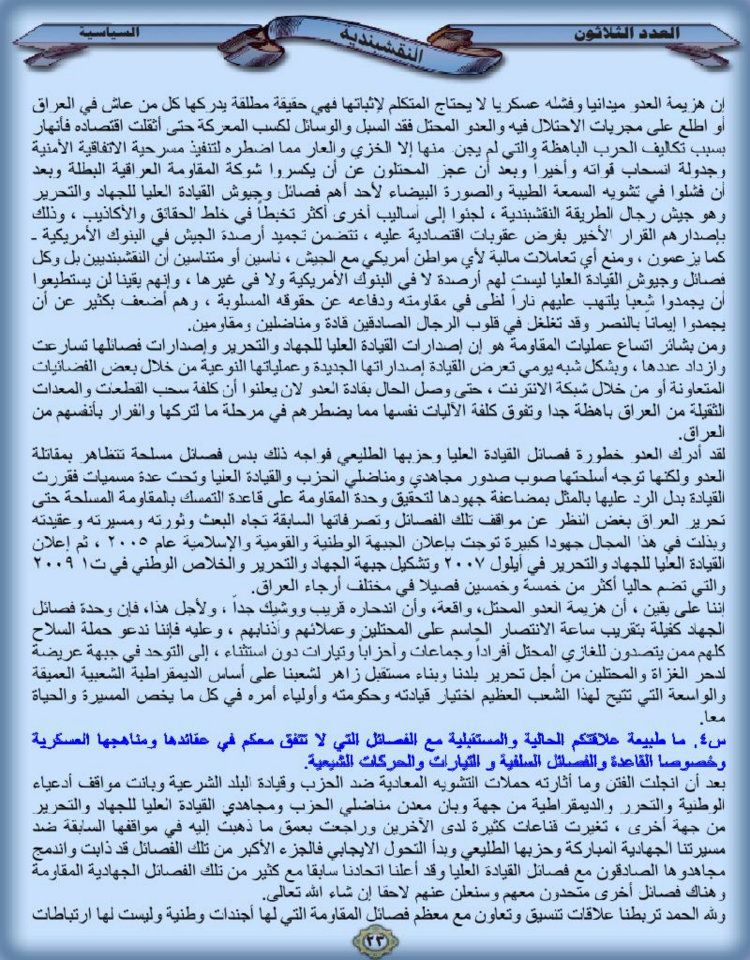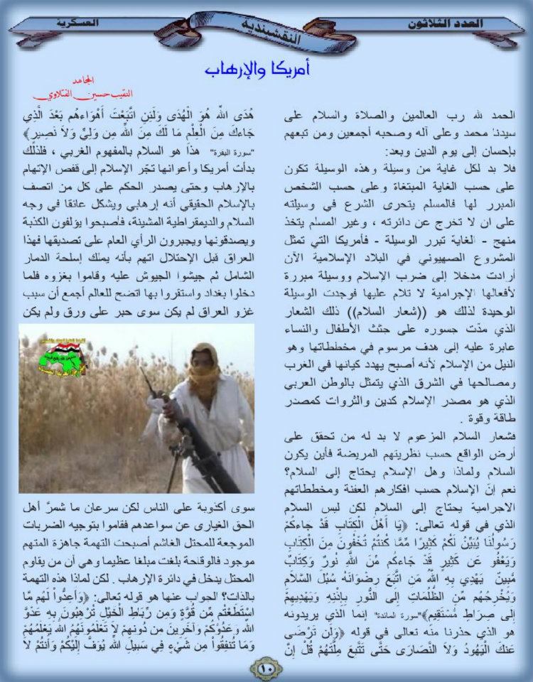 العدد الثلاثون جانب من العمليات الجهادية لجيش رجال الطريقة النقشبندية للفترة من 1 نيسان 2010 م ولغاية 30 نيسان 2010 م 21 مارس، 201225 يونيو، 2019 جانب من العمليات الجهادية لجيش رجال الطريقة النقشبندية للفترة من 1 نيسان 2010 م ولغاية 30 نيسان 2010 م ... قراءة المزيد