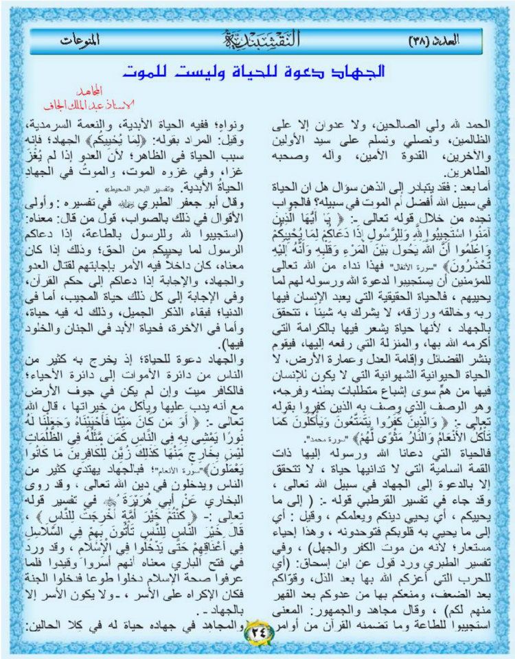 العدد الثامن والثلاثون الجهاد دعوة للحياة وليست للموت 1 مارس، 201225 يونيو، 2019 الجهاد دعوة للحياة وليست للموت ... قراءة المزيد
