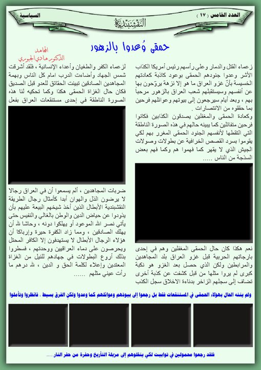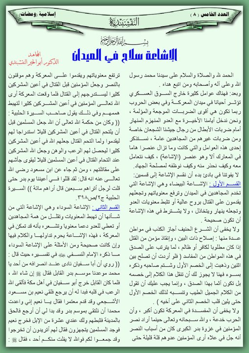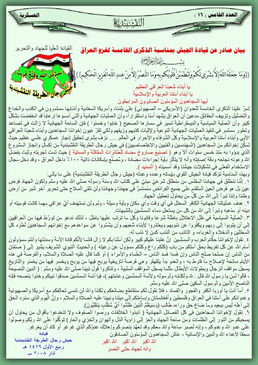 العدد الخامس جانب من العمليات الجهادية لجيش رجال الطريقة النقشبندية للفترة من 1 آذار 2008 م ولغاية 31 آذار 2008 م 4 مارس، 201225 يونيو، 2019 جانب من العمليات الجهادية لجيش رجال الطريقة النقشبندية للفترة من 1 آذار 2008 م ولغاية 31 آذار 2008 م ... قراءة المزيد