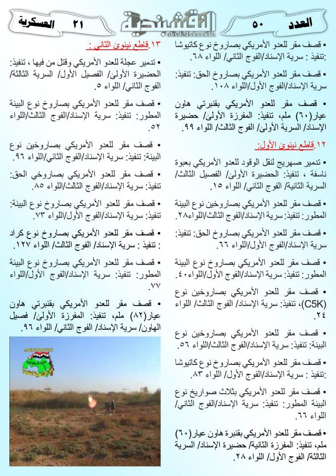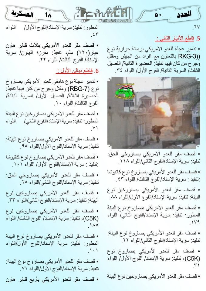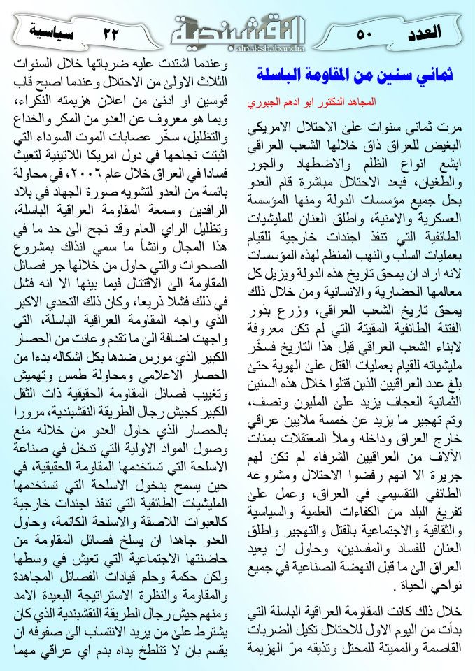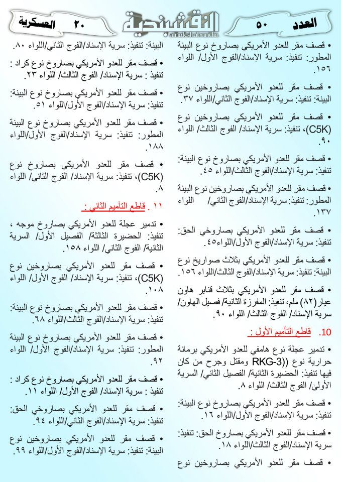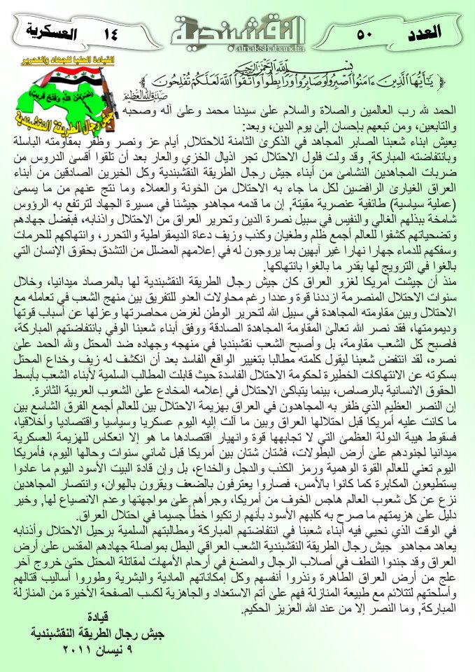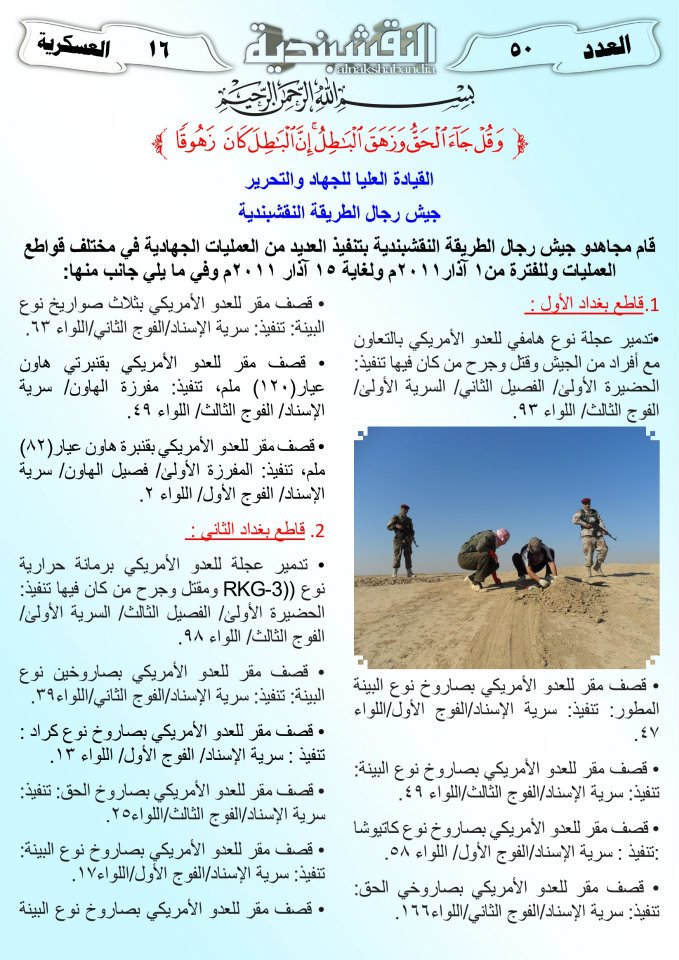 العدد الخمسون جانب من العمليات الجهادية لجيش رجال الطريقة النقشبندية للفترة من 1 آذار2011 الى 15 آذار2011 21 مارس، 201225 يونيو، 2019 جانب من العمليات الجهادية لجيش رجال الطريقة النقشبندية للفترة من 1 آذار2011 الى 15 آذار2011 ... قراءة المزيد