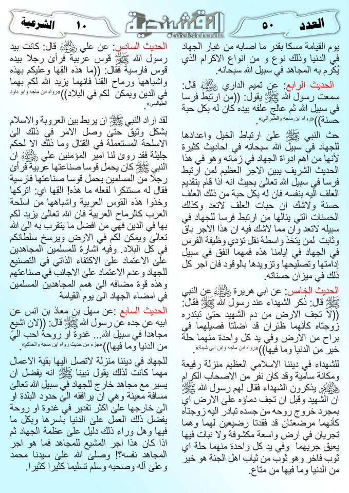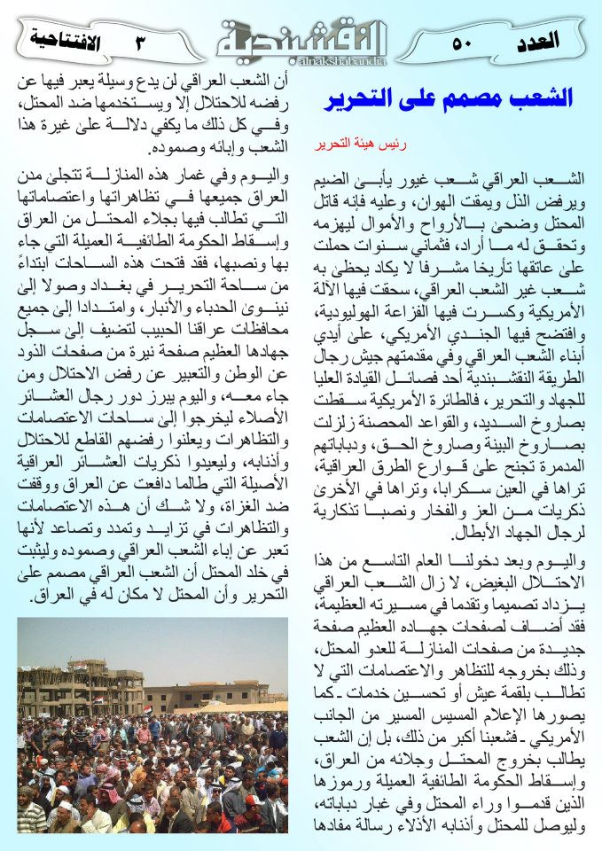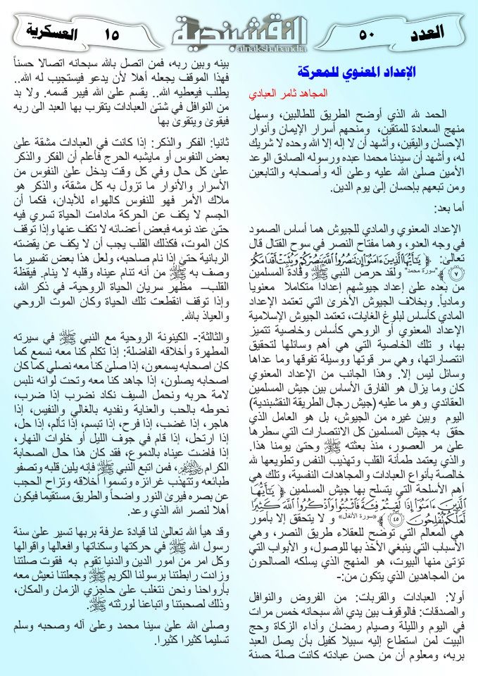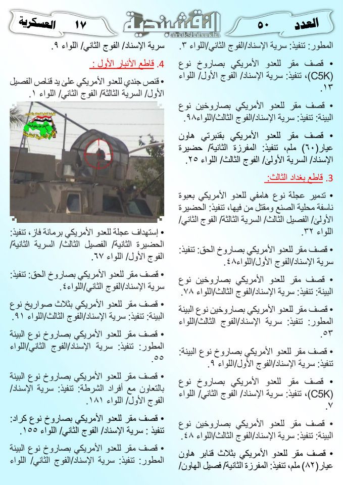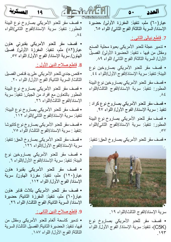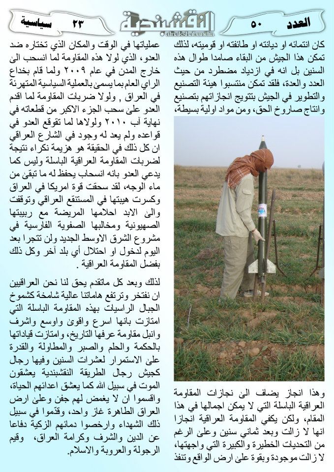 العدد الخمسون جانب من العمليات الجهادية لجيش رجال الطريقة النقشبندية للفترة من 1 آذار2011 الى 15 آذار2011 21 مارس، 201225 يونيو، 2019 جانب من العمليات الجهادية لجيش رجال الطريقة النقشبندية للفترة من 1 آذار2011 الى 15 آذار2011 ... قراءة المزيد