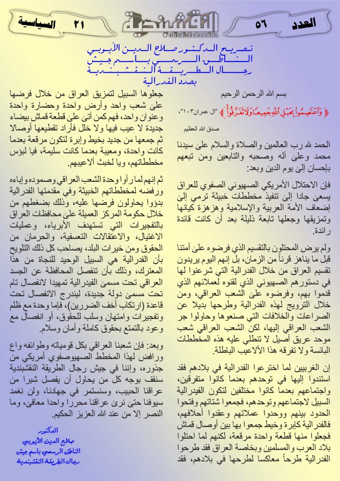العدد السادس والخمسون بيان صادر عن قيادة جيش رجال الطريقة النقشبندية 19 مارس، 201225 يونيو، 2019 بيان صادر عن قيادة جيش رجال الطريقة النقشبندية ... قراءة المزيد