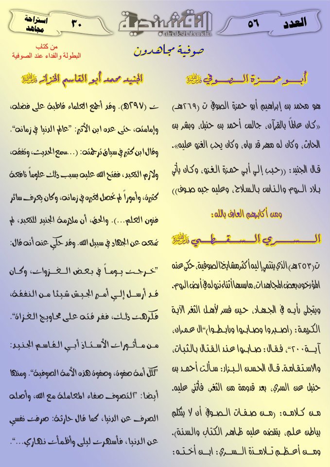 العدد السادس والخمسون صوفية مجاهدون 19 مارس، 201225 يونيو، 2019 صوفية مجاهدون أبو حمزة الصوفي , السري السقطي ,الجنيد محمد أبو القاسم الخزاز قدس الله اسرارهم ... قراءة المزيد