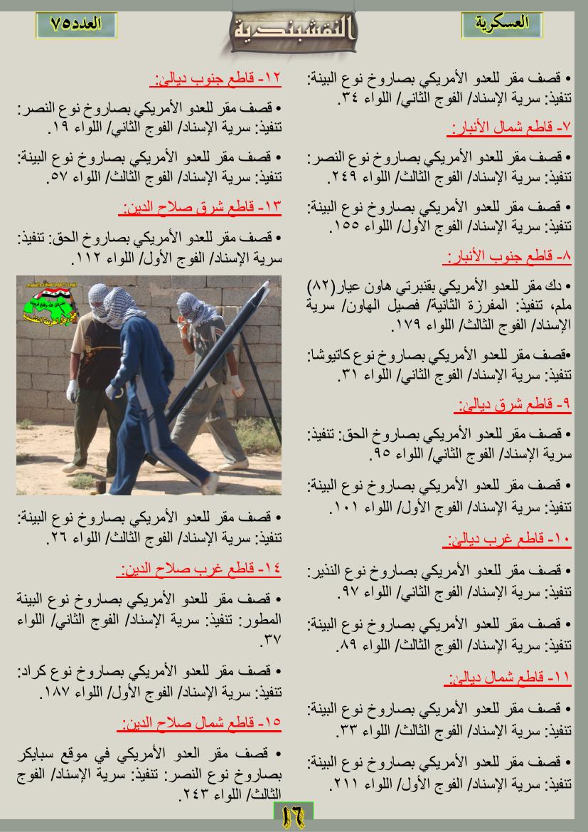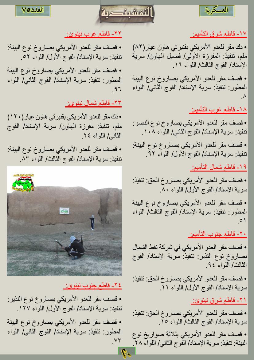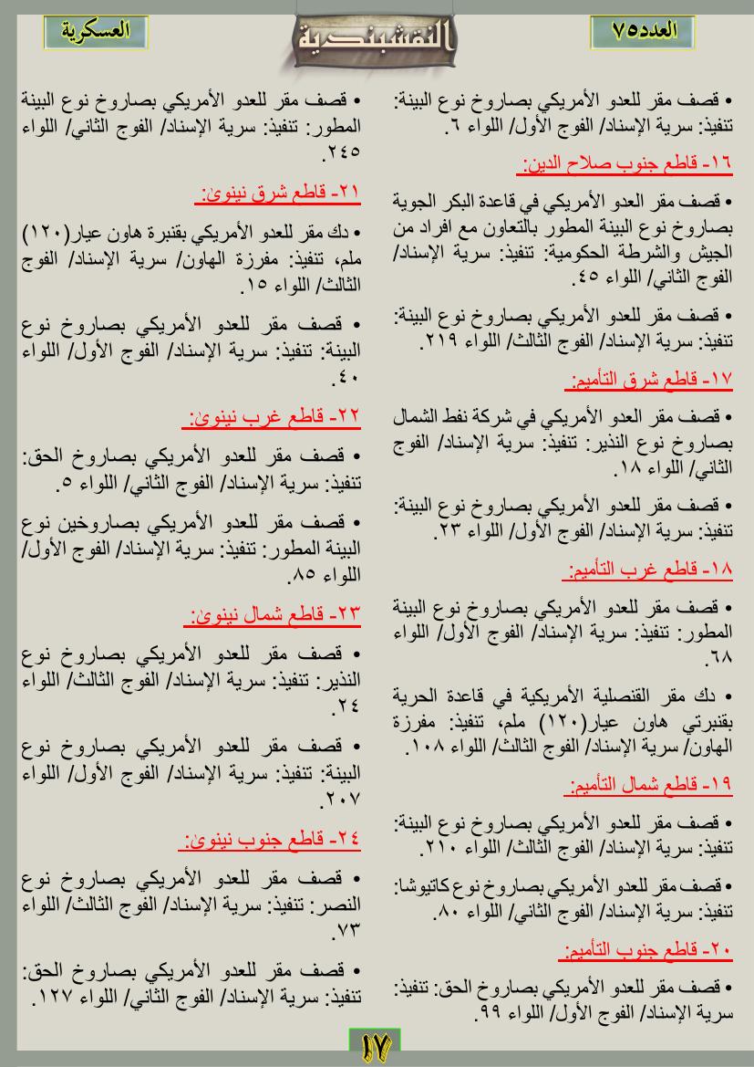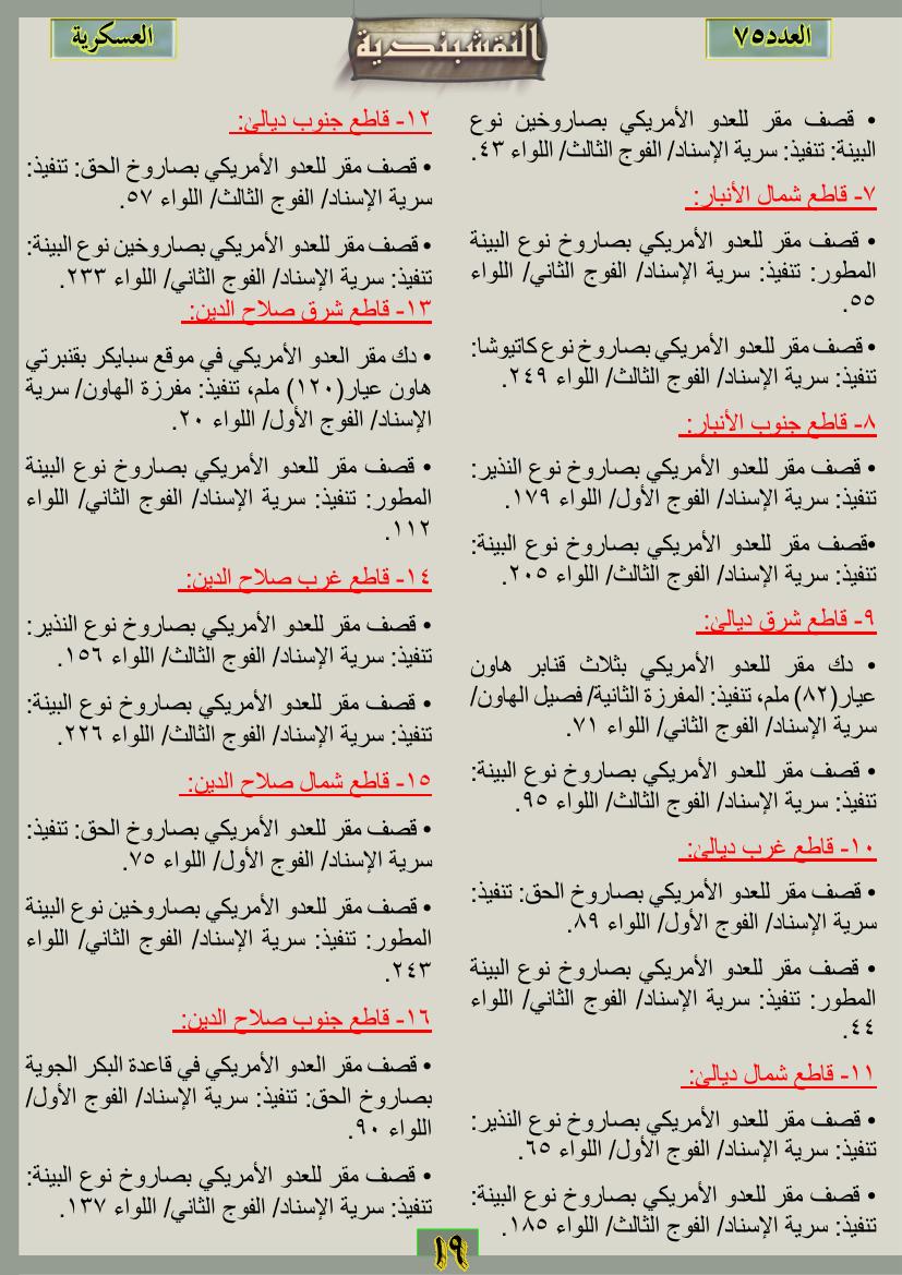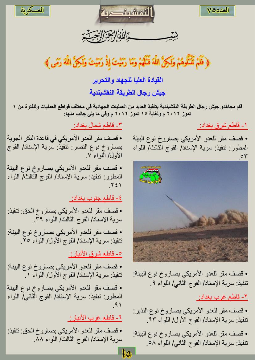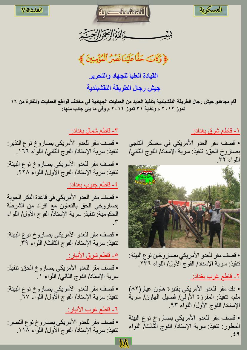 العدد الخامس والسبعون جانب من العمليات الجهادية للفترة من 1 تموز2012م ولغاية 31تموز 2012م 12 نوفمبر، 201225 يونيو، 2019 جانب من العمليات الجهادية للفترة من 1 تموز2012م ولغاية 31تموز 2012م ... قراءة المزيد