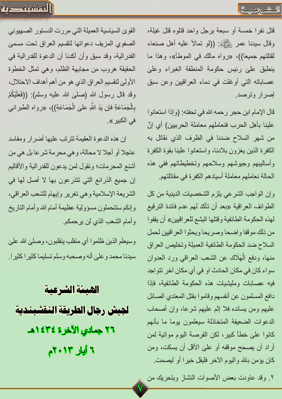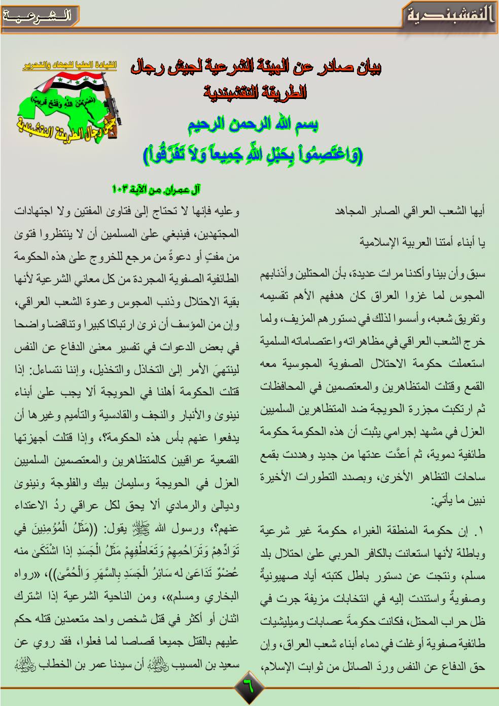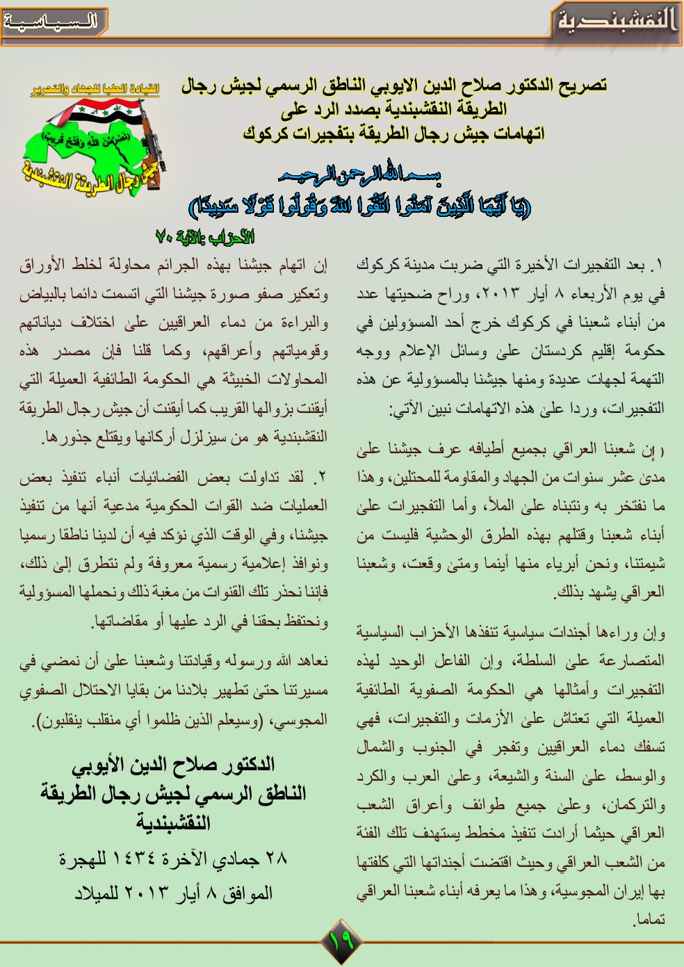تصريح الدكتور صلاح الدين الايوبي الناطق الرسمي لجيش رجال الطريقة النقشبندية بصدد الرد على الاتهامات الموجهة لجيش رجال الطريقة النقشبندية بتفجيرات كركوك