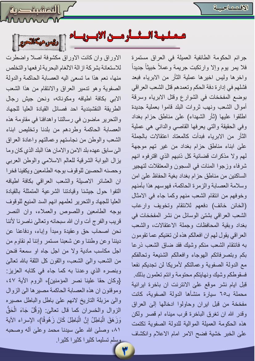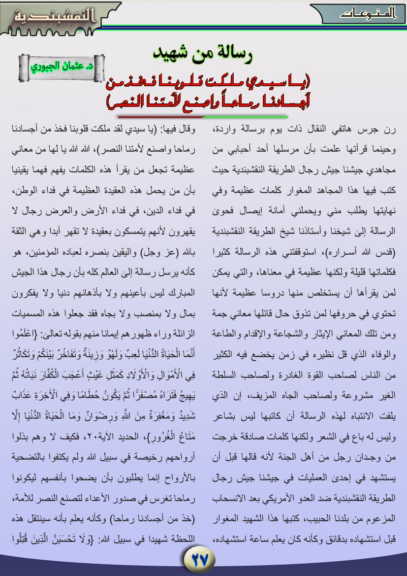 العدد الرابع والثمانون جانب من العمليات الجهادية لجيش رجال الطريقة النقشبندية للفترة من 1 نيسان 2013 ولغاية 30 نيسان2013 28 أكتوبر، 201325 يونيو، 2019 جانب من العمليات الجهادية لجيش رجال الطريقة النقشبندية للفترة من 1 نيسان 2013 ولغاية 30 نيسان2013 ... قراءة المزيد