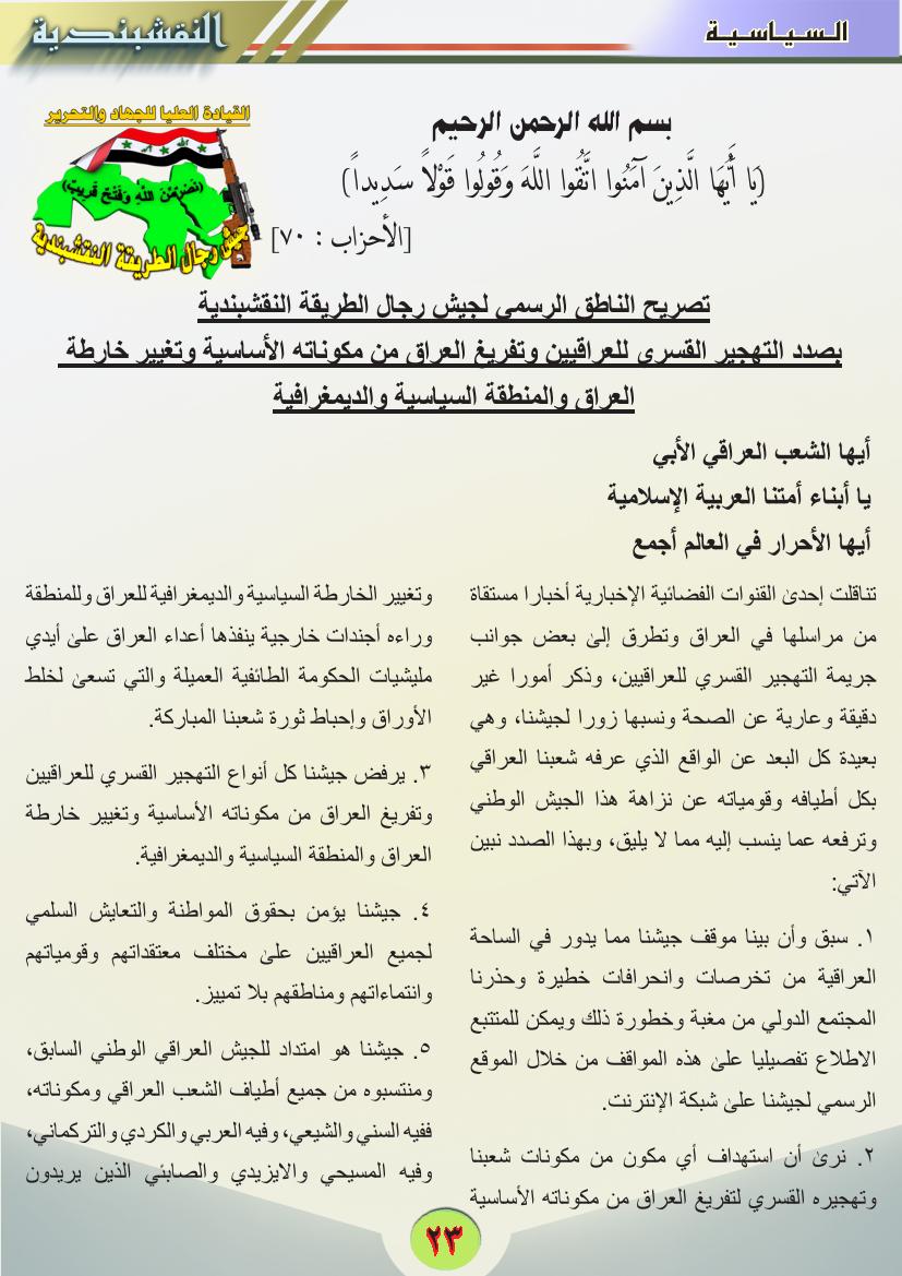 تصريح الناطق الرسمي لجيش رجال الطريقة النقشبندية بصدد التهجير القسري للعراقيين
