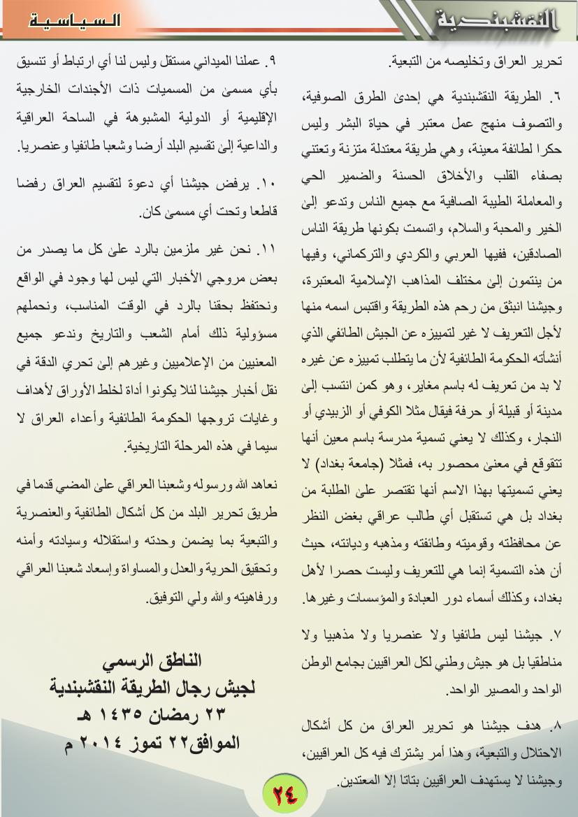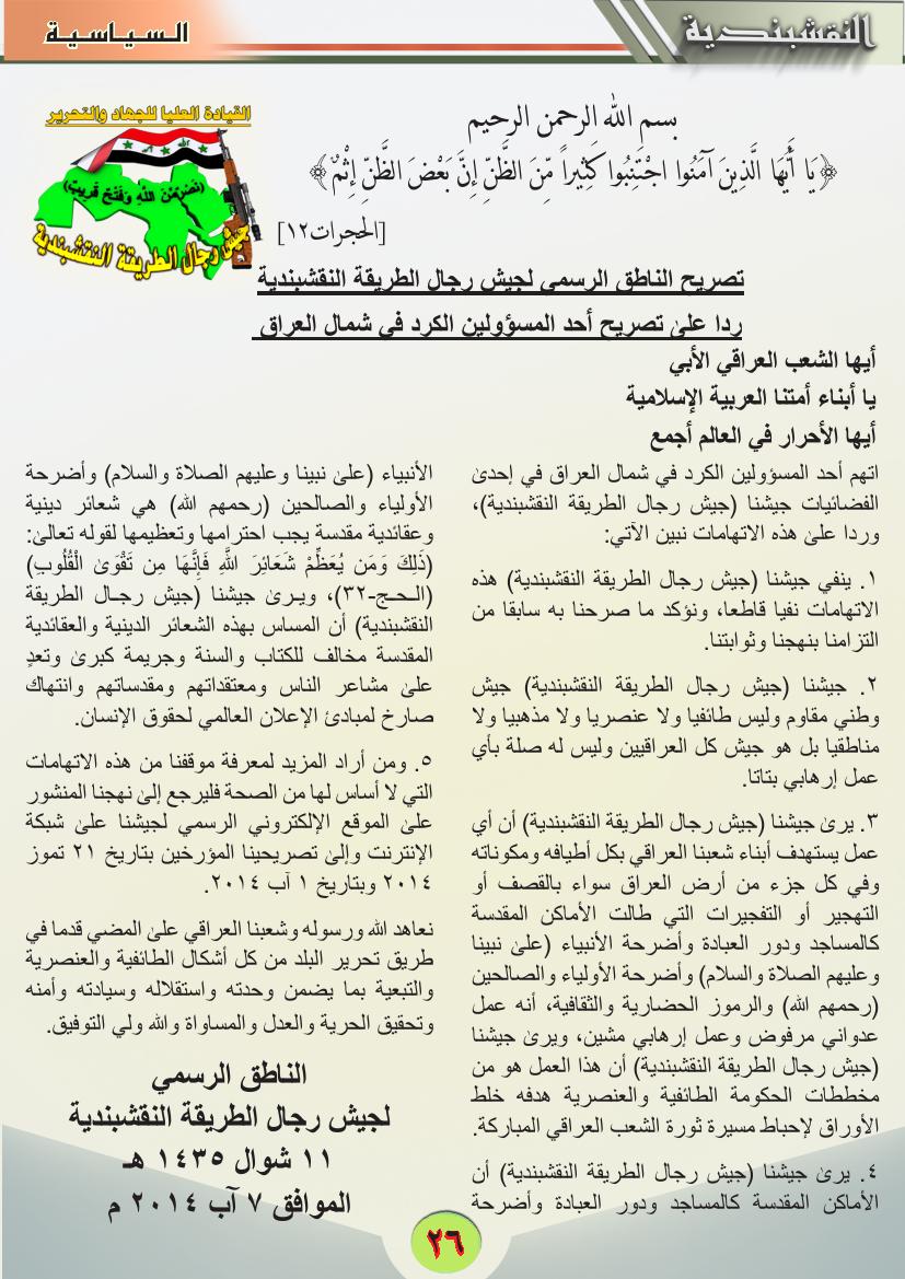تصريح الناطق الرسمي لجيش رجال الطريقة النقشبندية ردا على تصريح أحد المسؤولين