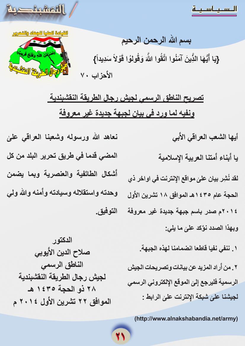 العدد التسعون تصريح الناطق الرسمي لجيش رجال الطريقة النقشبندية ونفيه لما ورد في بيان لجبهة جديدة غير معروفة. 3 يناير، 201525 يونيو، 2019 تصريح الناطق الرسمي لجيش رجال الطريقة النقشبندية ونفيه لما ورد في بيان لجبهة جديدة غير معروفة ... قراءة المزيد