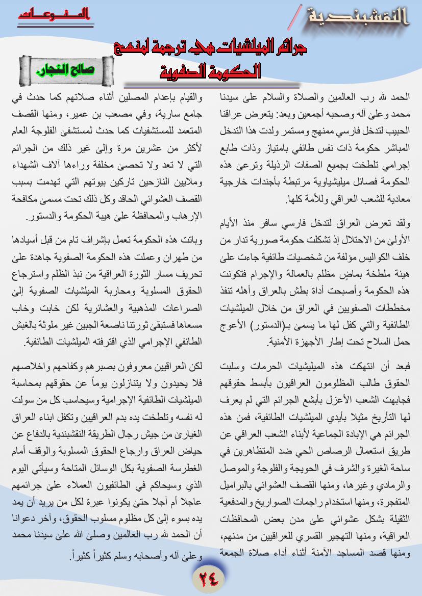 العدد التسعون جرائم المليشيات هي ترجمة لمنهج الحكومة الصفوية 3 يناير، 201525 يونيو، 2019 جرائم المليشيات هي ترجمة لمنهج الحكومة الصفوية ... قراءة المزيد