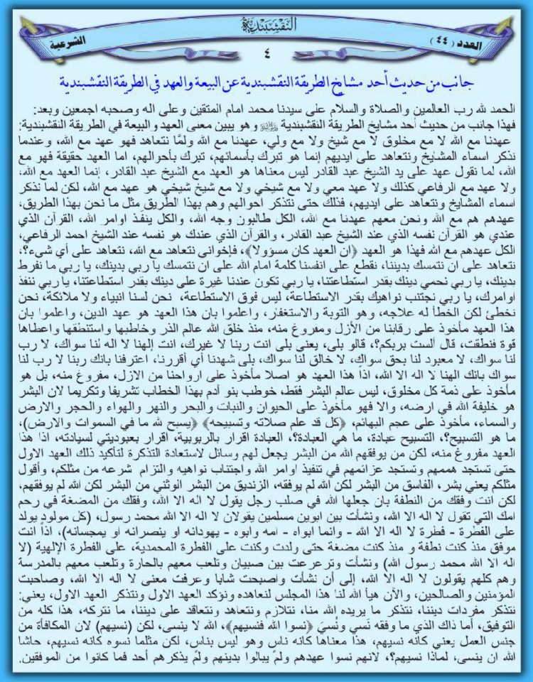 جانب من حديث مشايخ الطريقة النقشبندية البيعة والعهد في الطريقة النقشبندية 21 مارس، 201225 يونيو، 2019 جانب من حديث احد مشايخ الطريقة النقشبندية عن البيعة والعهد في الطريقة النقشبندية ... قراءة المزيد