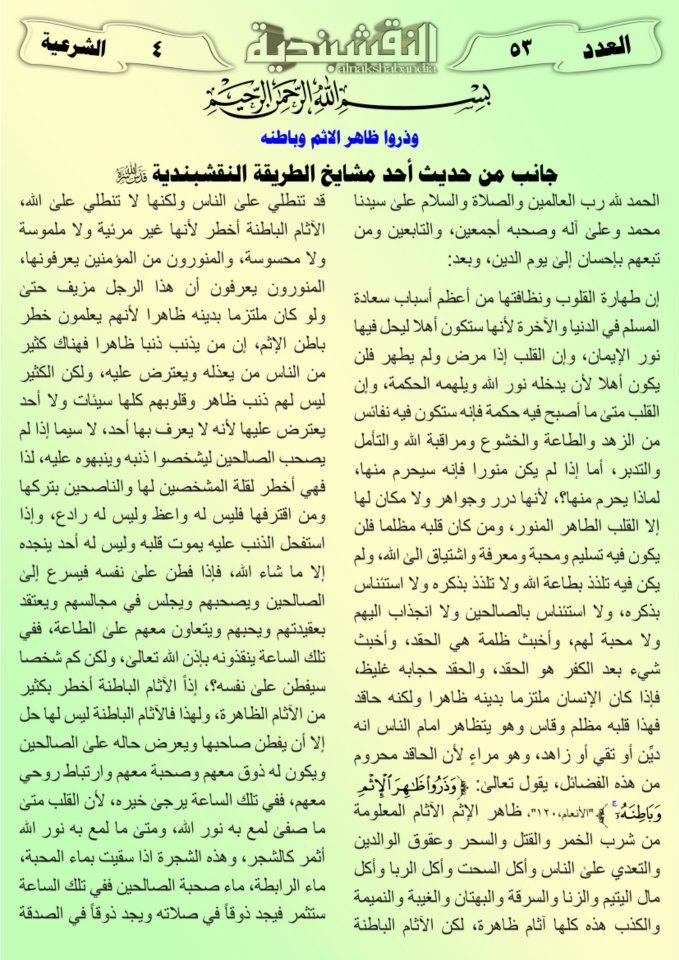 جانب من حديث مشايخ الطريقة النقشبندية وذروا ظاهر الاثم وباطنه 20 مارس، 201225 يونيو، 2019 وذروا ظاهر الاثم وباطنه جانب من حديث أحد مشايخ الطريقة النقشبندية قدس الله سره ... قراءة المزيد