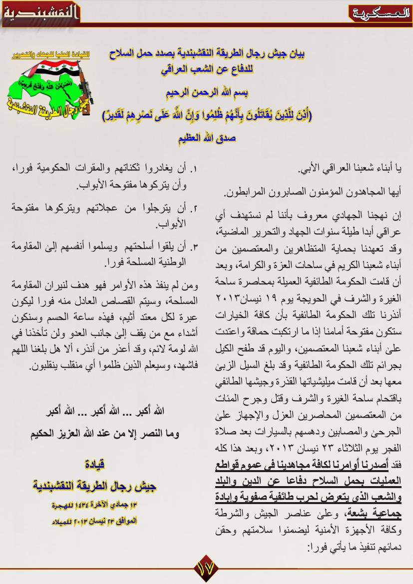 العدد الثمانون بيان جيش رجال الطريقة النقشبندية بصدد حمل السلاح للدفاع عن الشعب العراقي 17 مايو، 201325 يونيو، 2019 بيان جيش رجال الطريقة النقشبندية بصدد حمل السلاح للدفاع عن الشعب العراقي ... قراءة المزيد