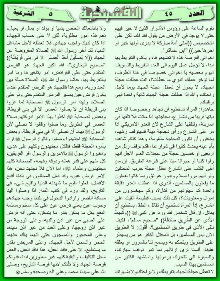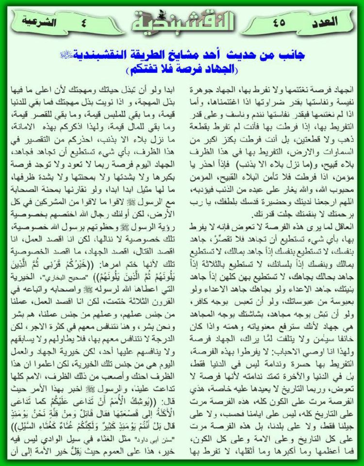 العدد الخامس والاربعون جانب من حديث أحد مشايخ الطريقة النقشبندية قدس الله سره الجهاد فرصة فلاتفتكم 21 مارس، 201225 يونيو، 2019 جانب من حديث أحد مشايخ الطريقة النقشبندية قدس الله سره الجهاد فرصة فلاتفتكم ... قراءة المزيد