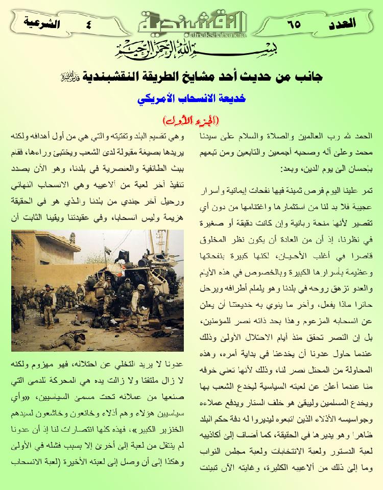 العدد الخامس والستون جانب من حديث أحد مشايخ الطريقة النقشبندية قدس الله سره -خديعة الانسحاب الامريكي الجزء الاول 21 مارس، 201225 يونيو، 2019 جانب من حديث أحد مشايخ الطريقة النقشبندية قدس الله سره خديعة الانسحاب الامريكي الجزء الاول ... قراءة المزيد